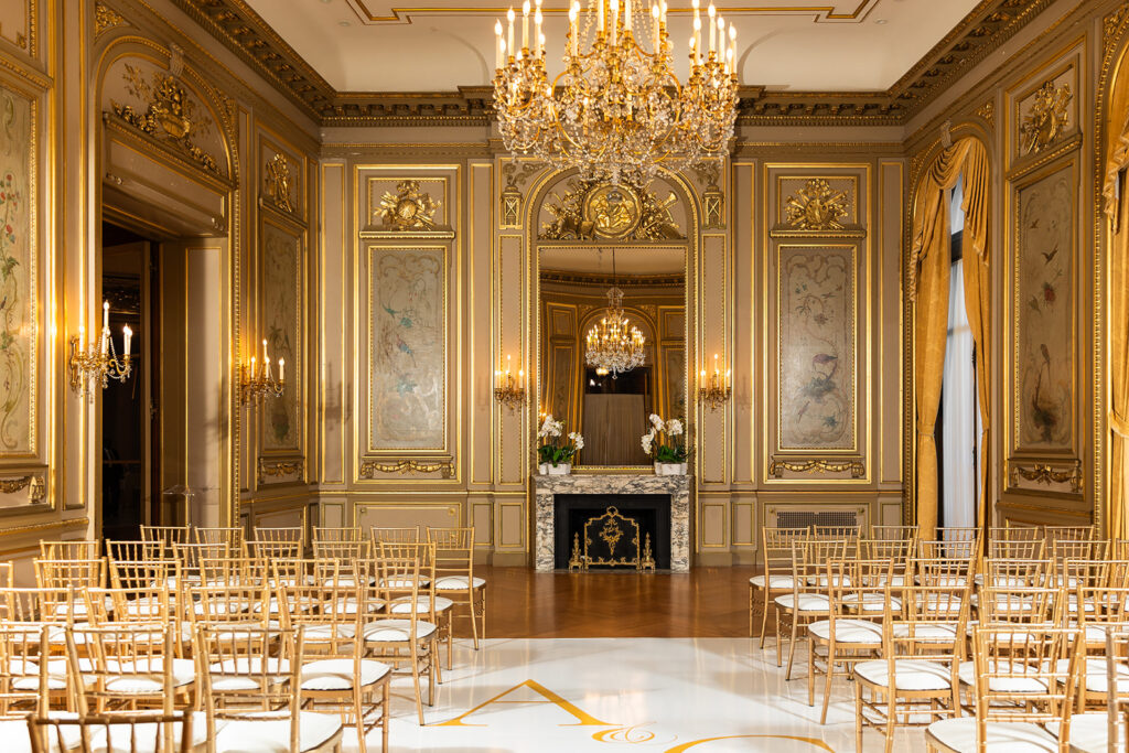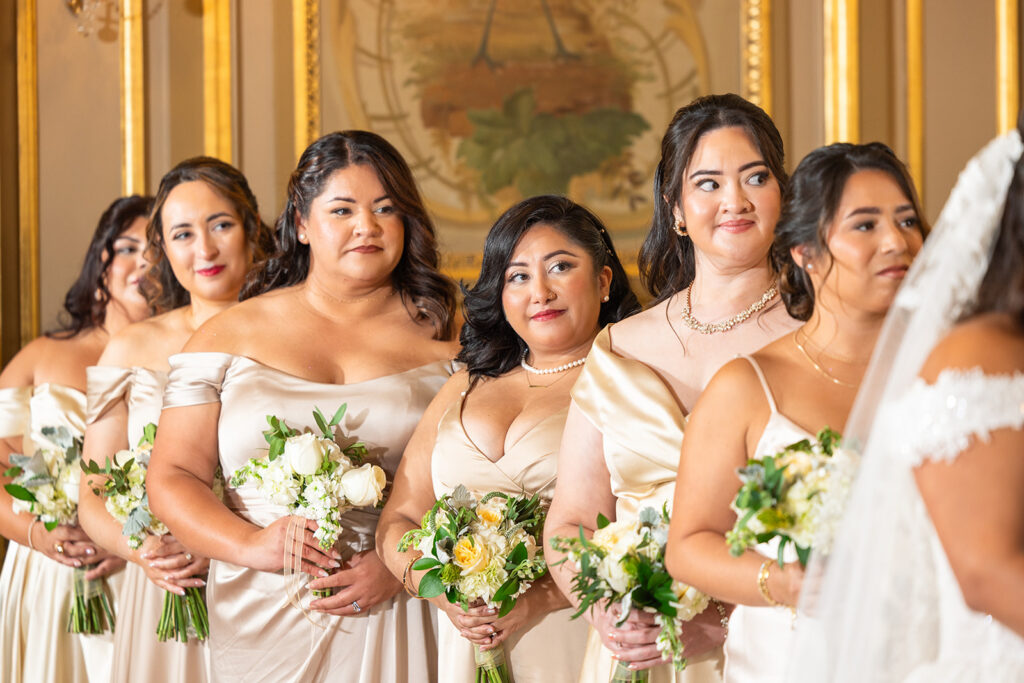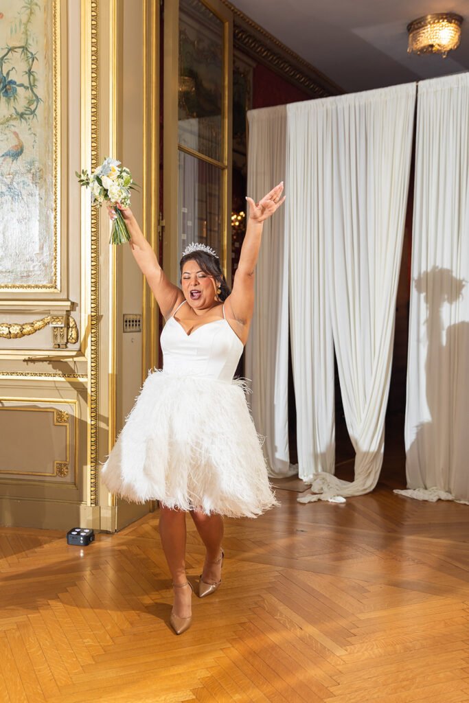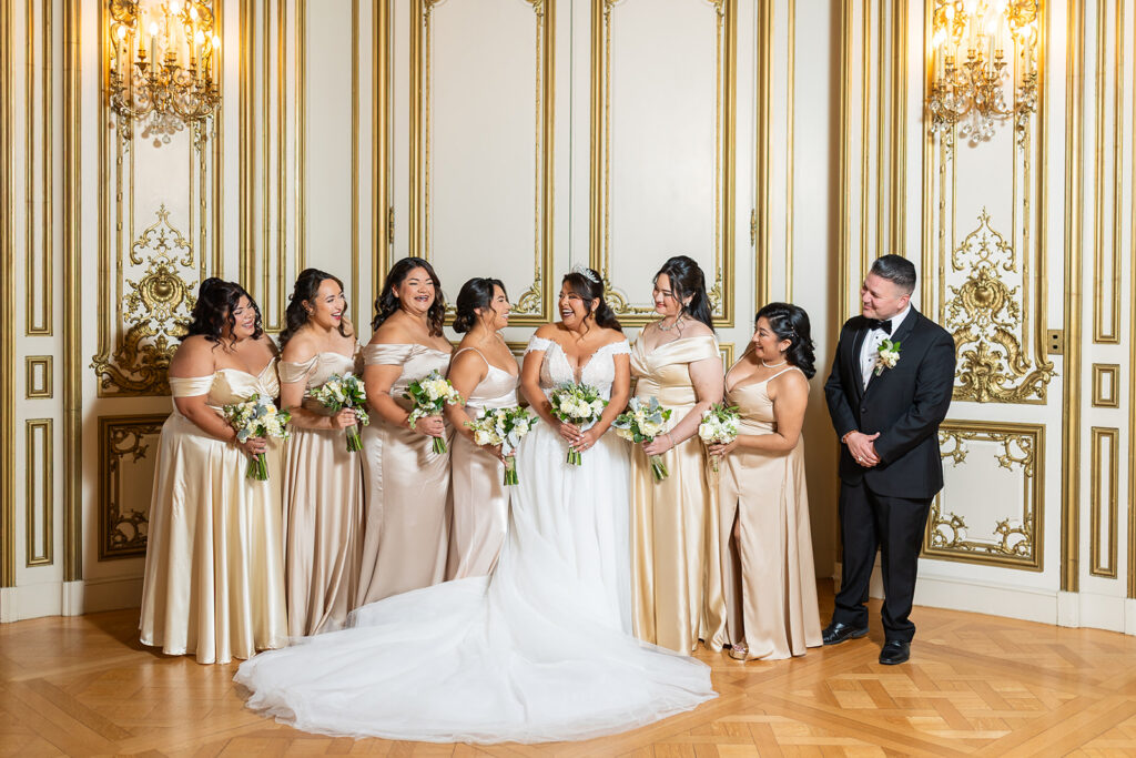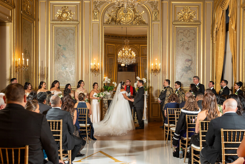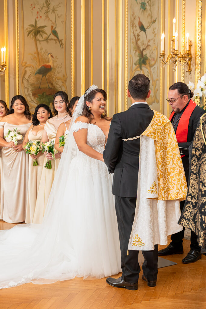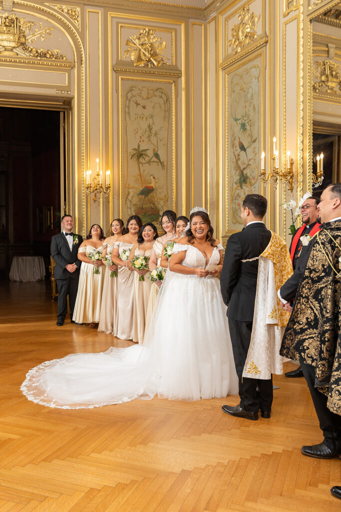 Clad in beautiful satin champaign and classic black, the wedding party arrived in style! The colors Abi and Christian chose paired beautifully with the gilded aesthetic of the Perry Belmont House. Instead of contrasting with pops of color, they chose to accentuate the existing beauty.