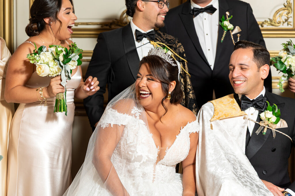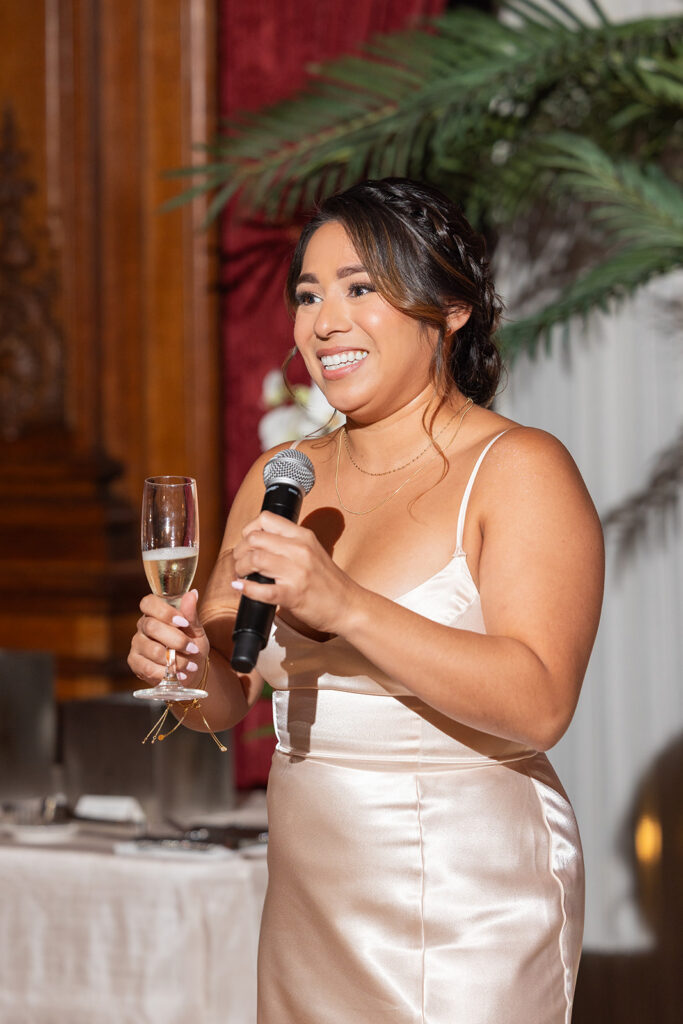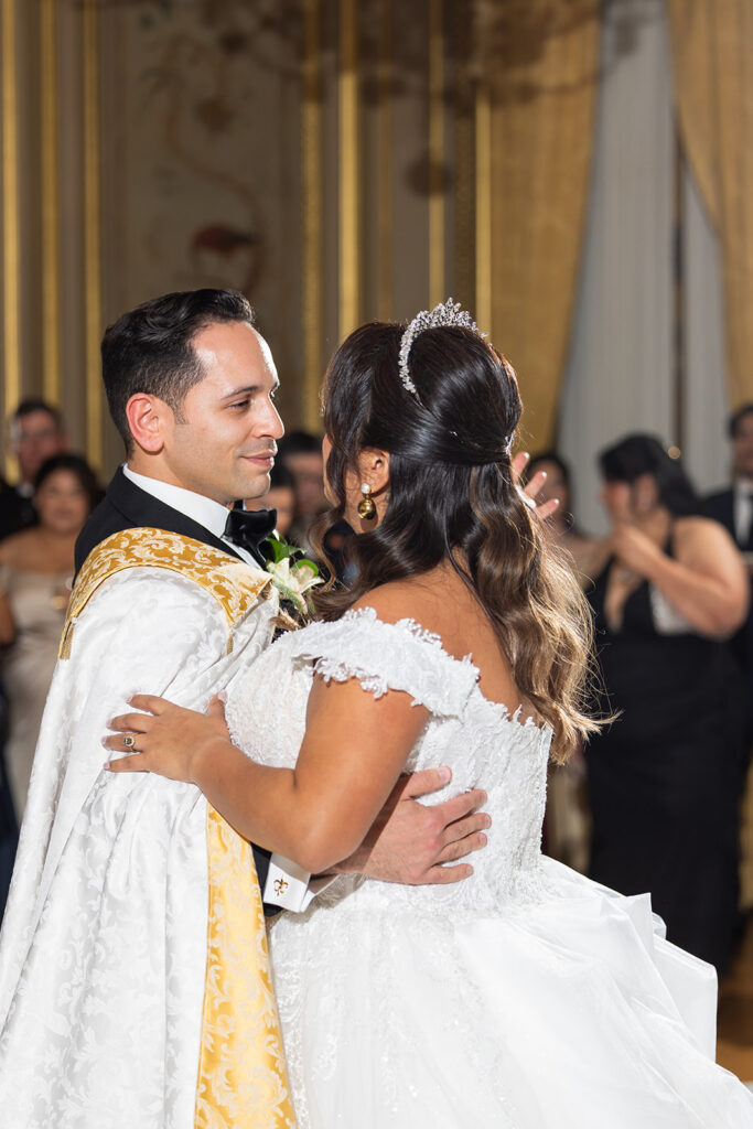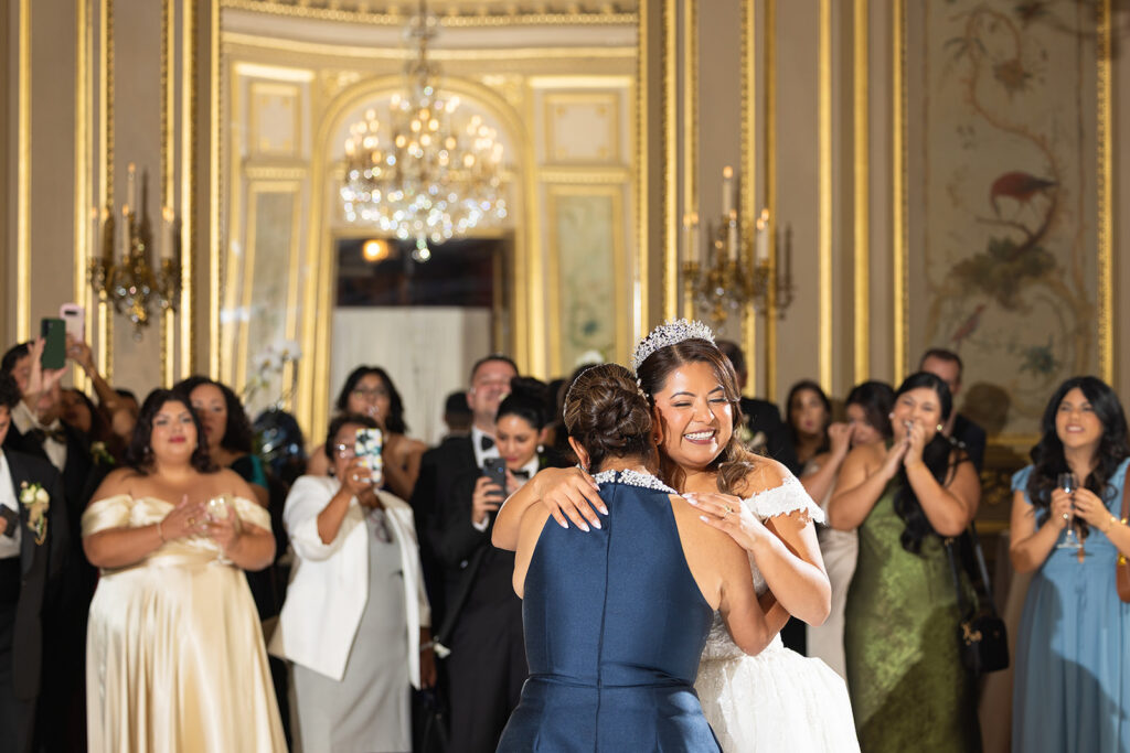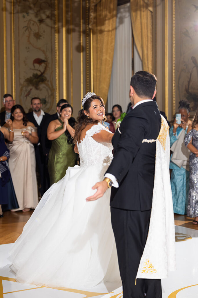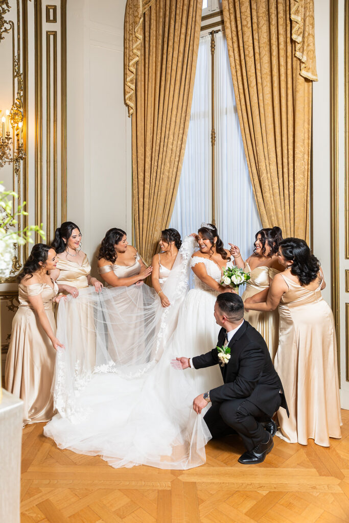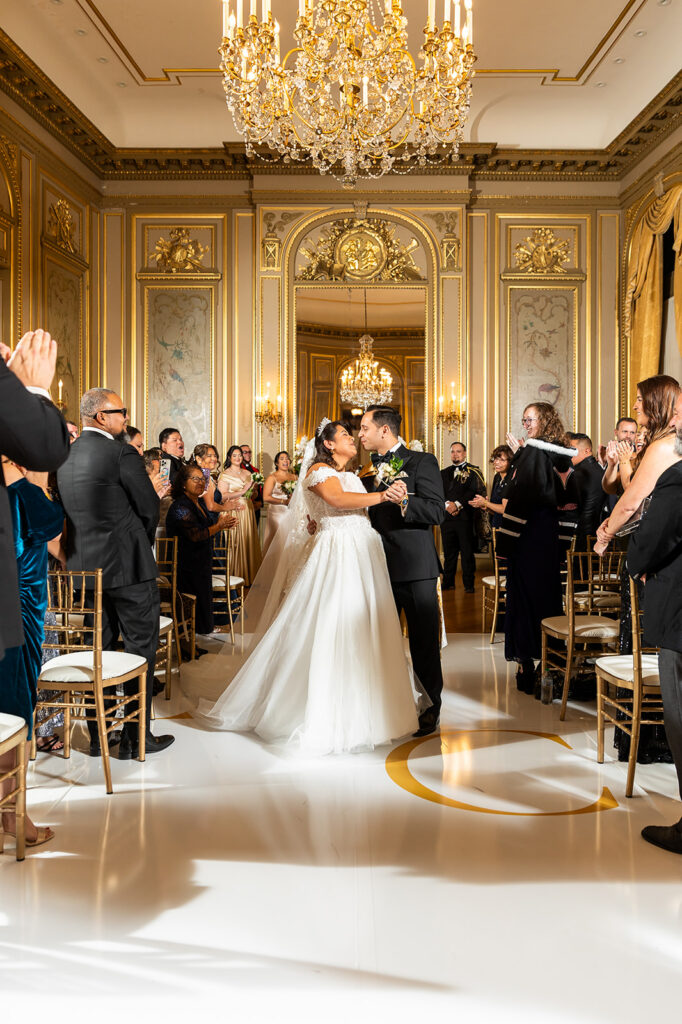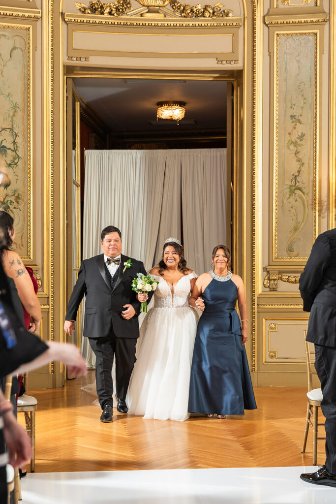 Clad in beautiful satin champaign and classic black, the wedding party arrived in style! The colors Abi and Christian chose paired beautifully with the gilded aesthetic of the Perry Belmont House. Instead of contrasting with pops of color, they chose to accentuate the existing beauty.