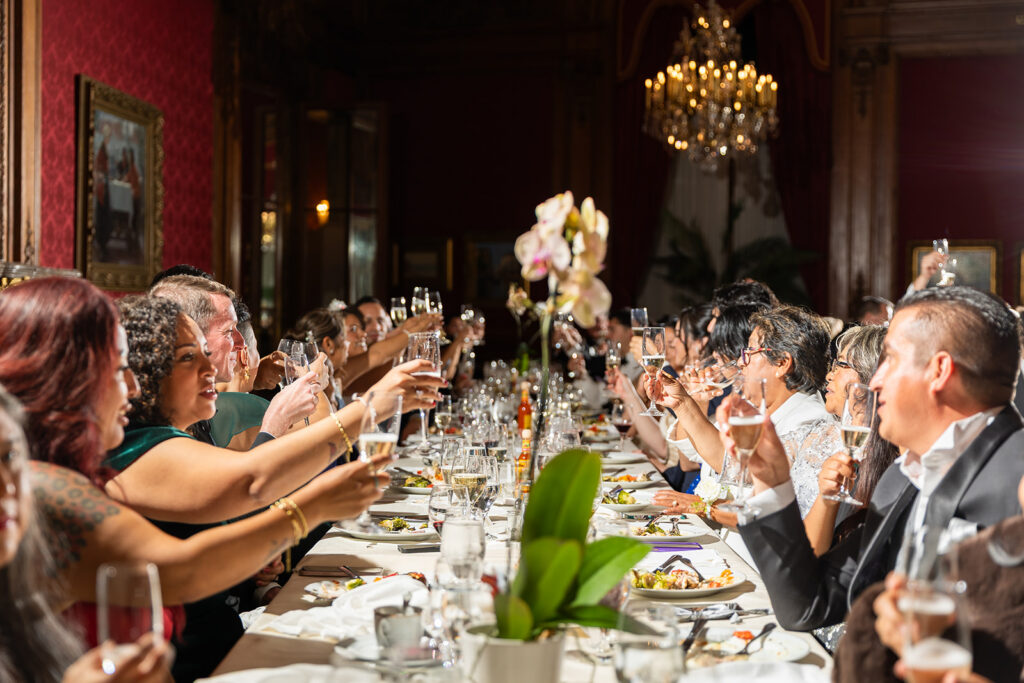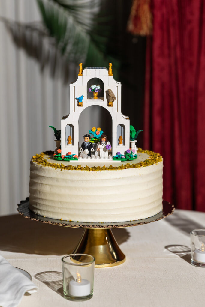 In an absolutely gorgeous room with ornate burgundy wallpaper, this dinner was one of my favorite parts of the day! Each room at this Perry Belmont House wedding offered it’s own unique vibe, and it was so fun to photograph each and every one of them. The tables were adorned with classic white orchids, and for a fun touch, Christian designed and built their wedding topper out of legos!